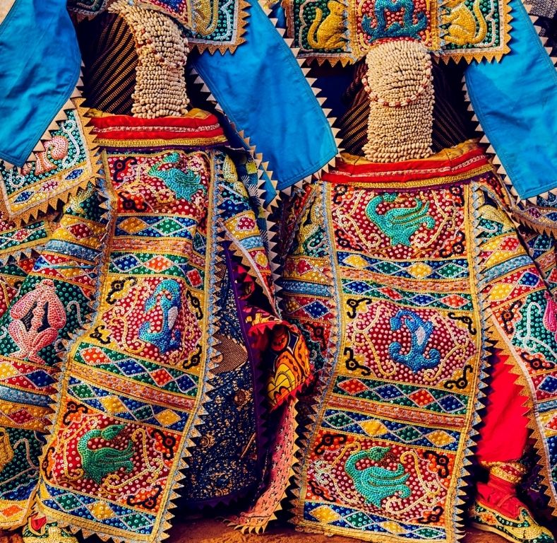 遊畢轉往欣賞埃貢岡面具表演,表演的核心是面具與服裝的華麗轉變:表演者全身包裹在多層繽紛織物中,包括蠟染布、刺繡、動物皮、貝殼和珠寶,面部覆以網狀布料隱藏身份,完全抹除人類輪廓,象徵祖靈降臨。表演伴隨巴塔鼓(Bata drums)和阿戈戈鈴(Agogo)的節奏,創造「呼應式」音樂,表演者旋轉舞蹈、揮臂、吟唱神話故事。